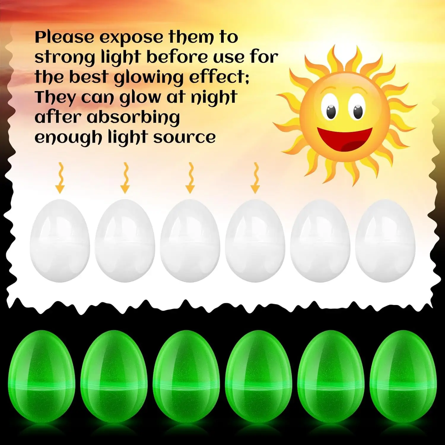 Material Information: these Easter Eggs are made of quality thick plastic, sturdy and reliable, colorless and odorless, safe to use, not easy to break or damage, allowing you to use them for a long time; Besides, please expose them to strong light before use for the glowing effect; They can glow at night after absorbing enough light source, full of creativity