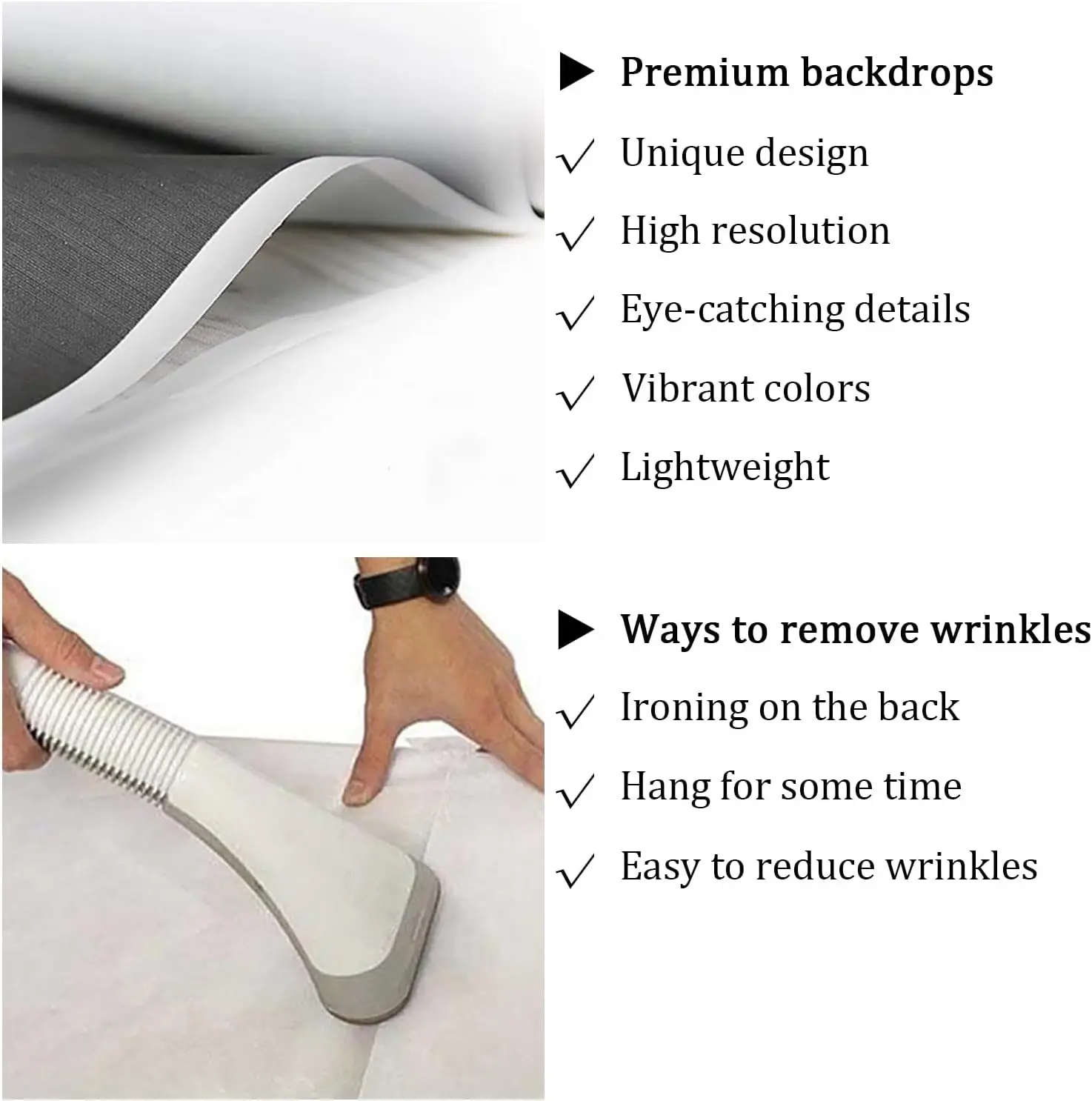[Warm Tips]: Here are ways to reduce backdrop wrinkles: If necessary, please iron the back side (not the image side) with low temperature(less than 90 degrees) to easily reduce the wrinkle.