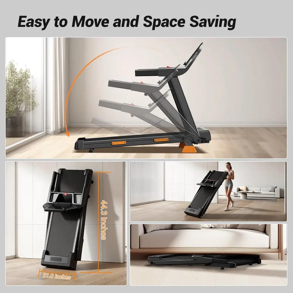 90% Pre-Assembled The compact treadmill comes with a 90% pre-assembled design, requiring no complicated installations. It allows for quick setup within minutes, so you can start your training right away. When fully folded, it measures only 44.3 x 21.8 x 4.1, making it a perfect choice for small spaces like apartments, offices, etc.