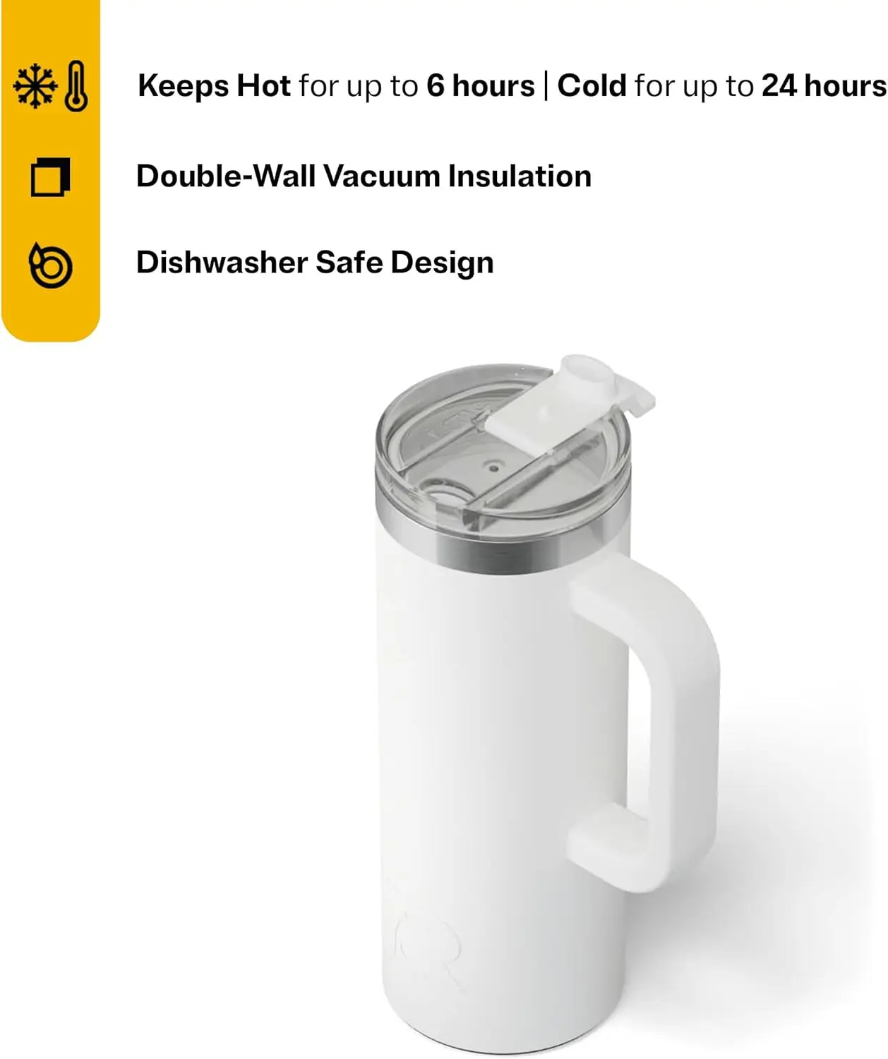 DOUBLE-WALL INSULATION: With double-wall vacuum insulation to keep drinks hot for up to 6 hours and cold for up to 24 hours, heat protection, and an airtight seal, this vacuum-insulated stainless steel travel mug with handle is perfect for any adventure