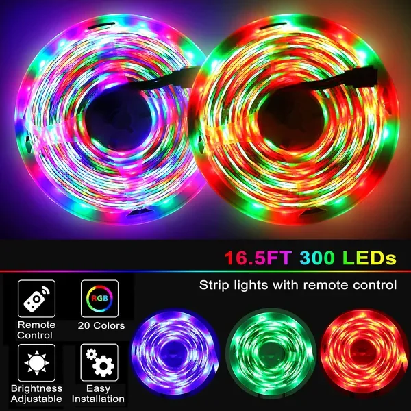 300 LEDs Strip Lights 5M/16.5ft 20 ColRGB LED Strip IP65 Waterproof with Remote