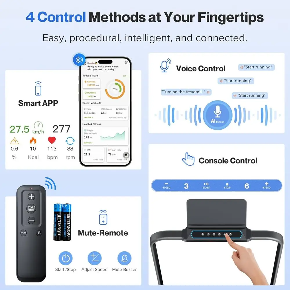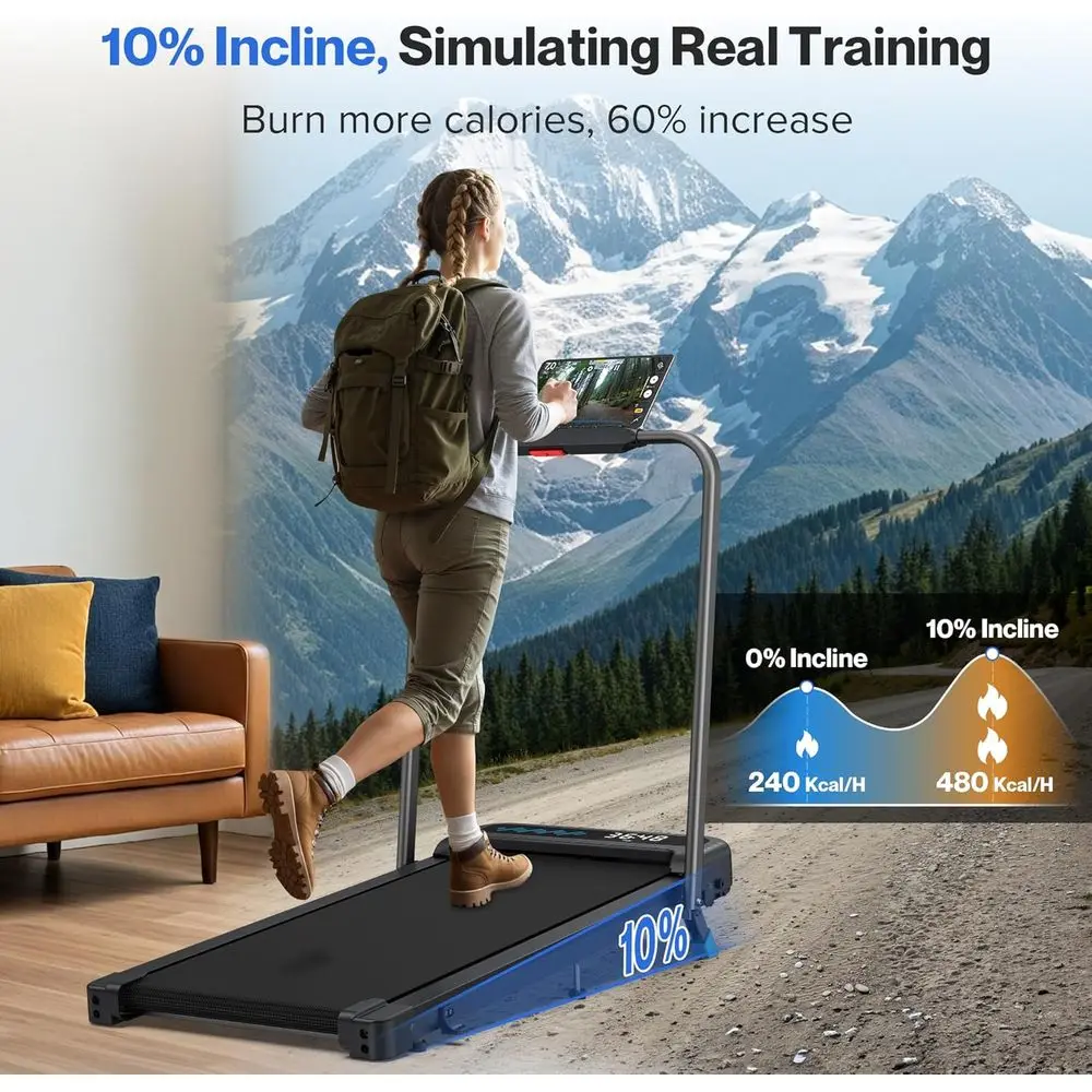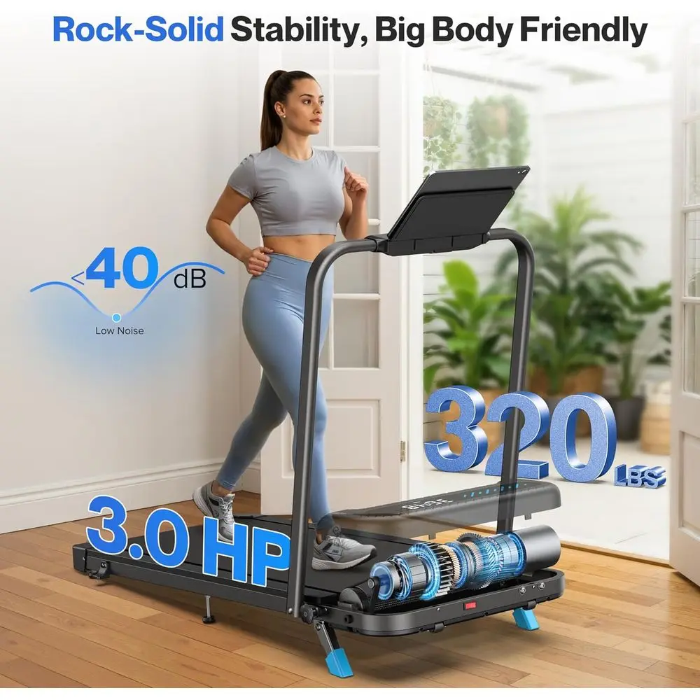 Special Feature: 4-in-1 folding treadmill suitable for home or office; 0.6 to 6.2 mph speed range and 10° incline; 3.0HP quiet motor, less than 40 dB; Smart APP; 4 Ways control; 320lbs capacity; 7-layer anti-slip design and 8 silicone shock absorbers; foldable walking pad treadmill with handle bar for small spaces.