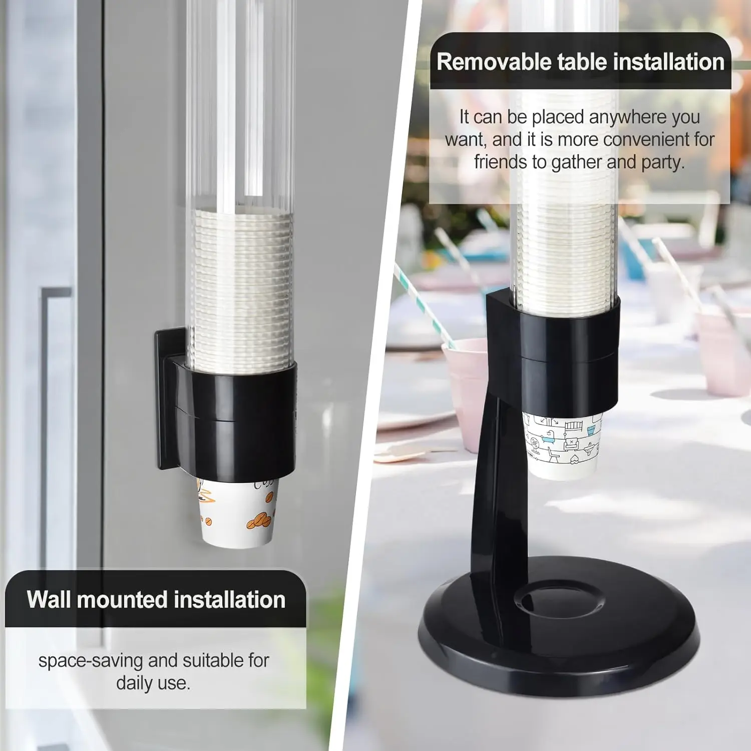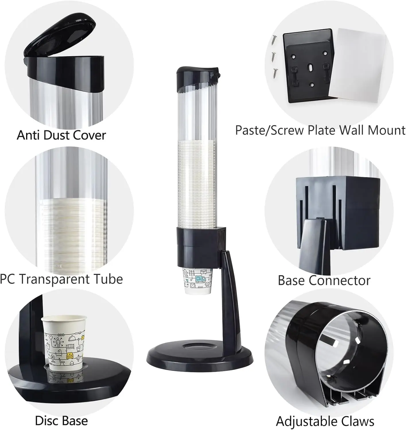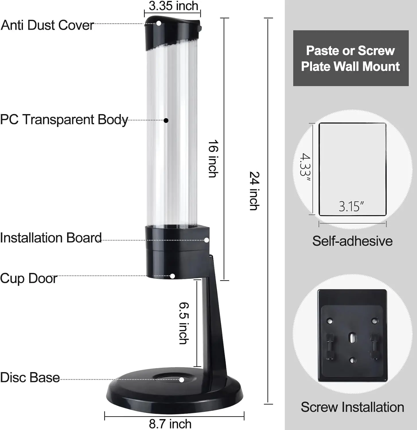 Self-Adjusting Dispenser: Suitable for disposable cup diameter 1.96 ~ 2.96 inch. Fits most 5oz – 7oz cone cups, flat bottom cups, plastic cups, double layer paper cups, etc. Easily take out the cups one by one.