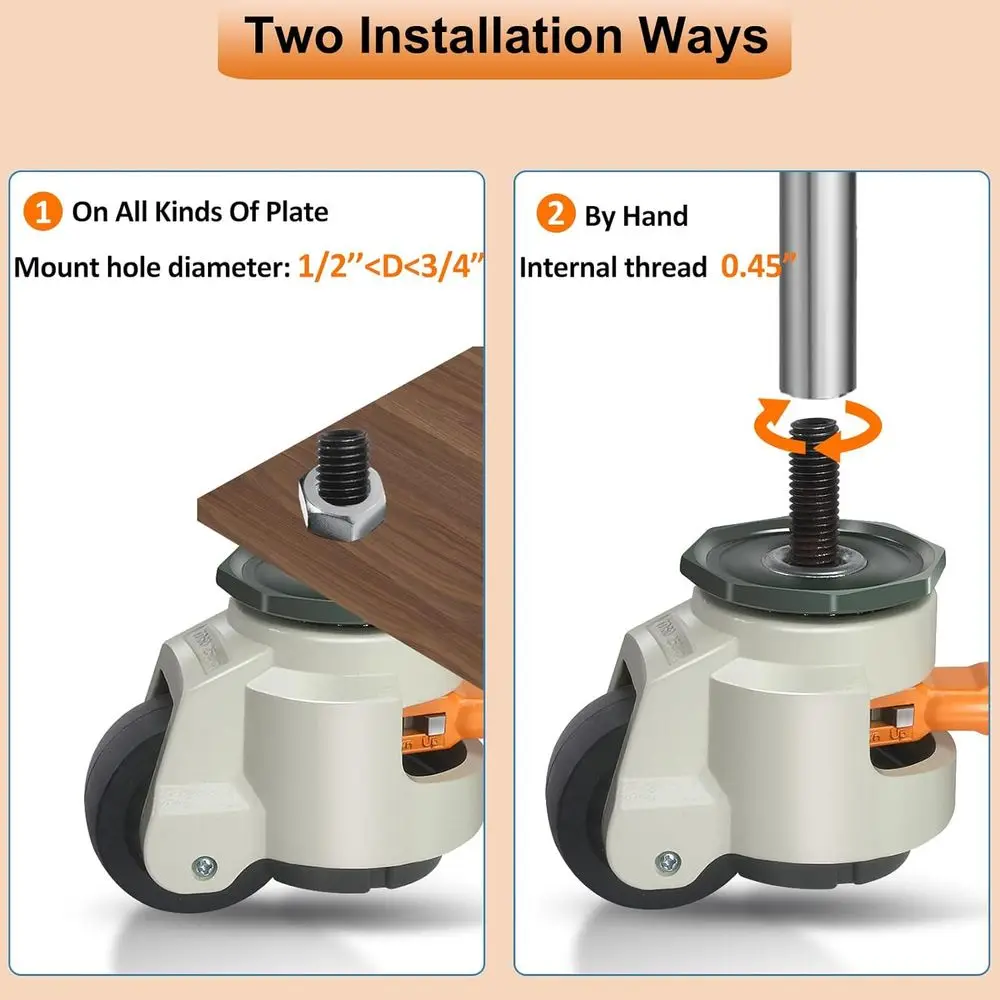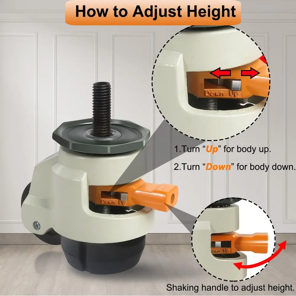 Adjustable Height Casters — A set of 4 heavy-duty leveling casters with an upgraded ratchet arm allows for easy adjustment to move or fix heavy equipment, furniture, or machinery. Installing these leveling casters can effectively address issues of lopsided or wobbly equipment caused by uneven floor surfaces.