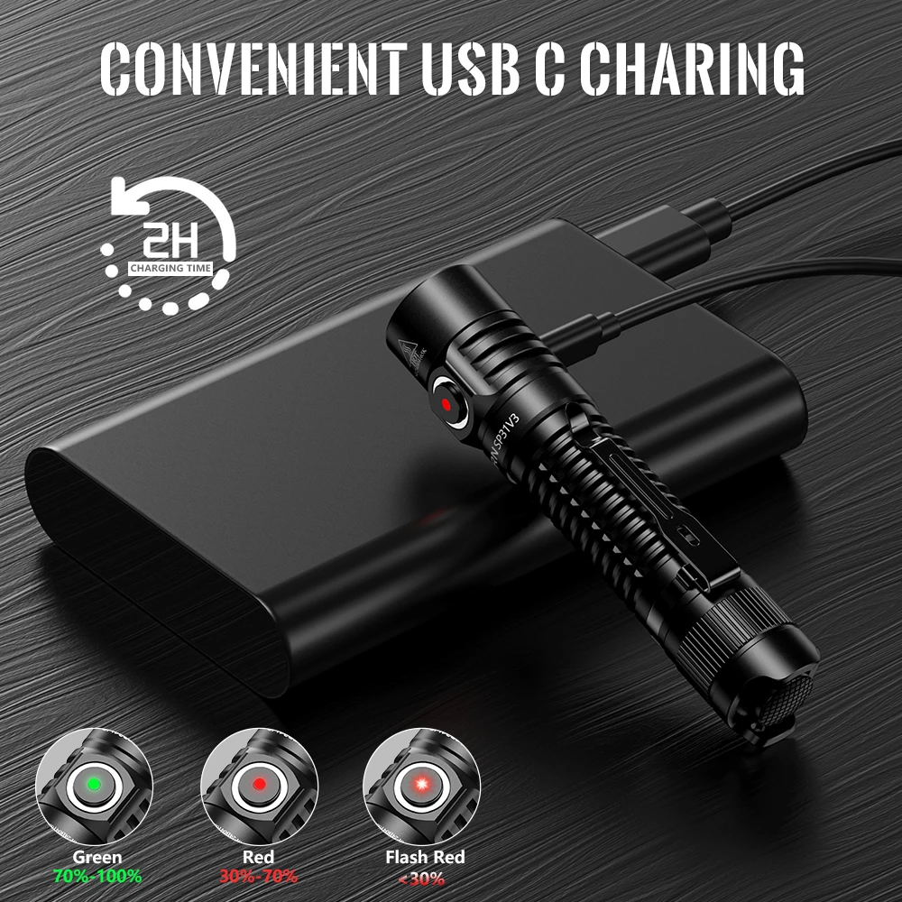 2. 【Type C Rechargeable】Sofirn SP31 V3.0 has a built-in Type-C charging port (included) for convenient rechargeable. When the indicator keep flashing red, it means that the power is less than 30% and you need to recharge the flashlight.