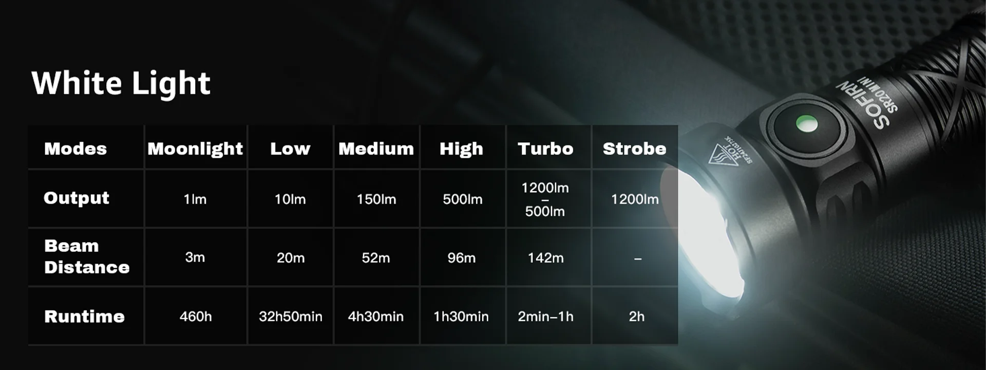 2. Powerful Performance with Adjustable Brightness: Featuring an adjustable brightness range from 1 lumen to 1200 lumens, the SR20 MINI can easily handle various situations. Whether you need a subtle glow for reading or a powerful beam for outdoor adventures, this flashlight has you covered.