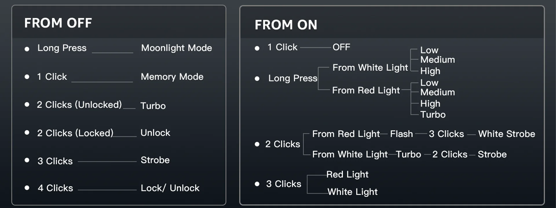 Note: When the flashlight is on, red indicator will keep flashing when the remaining battery is lower than 20%. The flashlight automatically turns off when the battery voltage is lower than 2.7V.