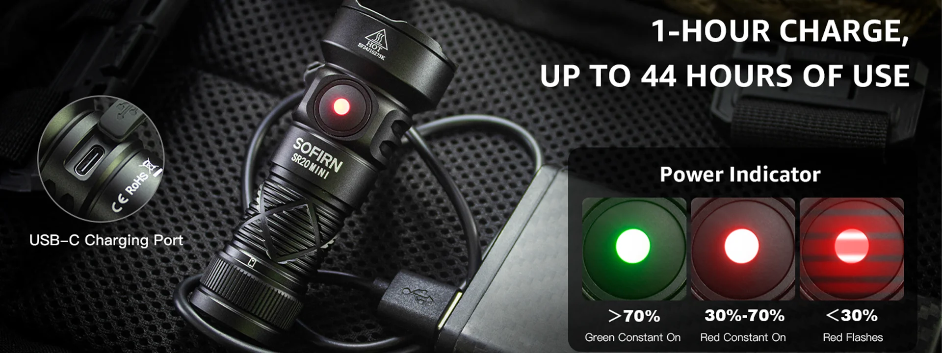 4. Rechargeable and Fast Charging with Type-C: Powered by a 18350 1100mAh battery, the SR20 MINI flashlight offers convenient USB Type-C charging with fast-charging capabilities. Simply recharge with the included cable and stay ready for your next adventure.