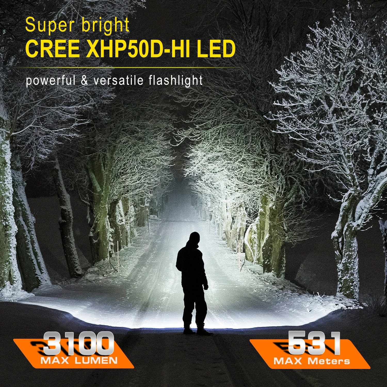 Sofirn C8L is a powerful, versatile flashlight designed for home, EDC or outdoor activities like camping, hiking, fishing or hunting. It's operated using two switches, a tactical tail switch and a side switch. It uses one 21700 battery and features a USB-C port for convenient charging.Super bright XHP50D-HILED givesoutput up to 3100lumens.