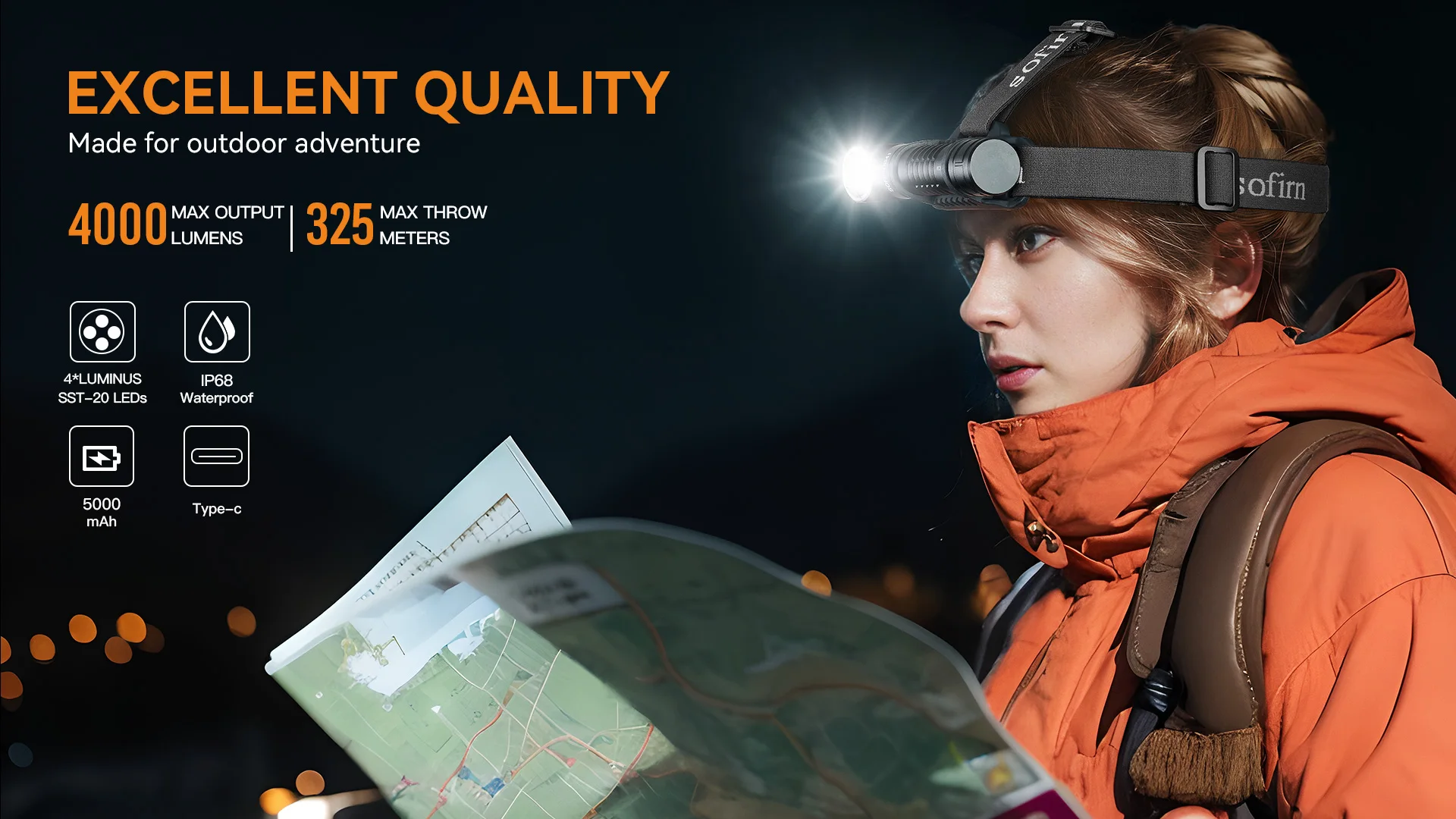 1. High Performance: Designed with 4 * SST20 LEDs, the powerful headlamp delivers a max output of 4000 lumens and 325 meters beam distance.