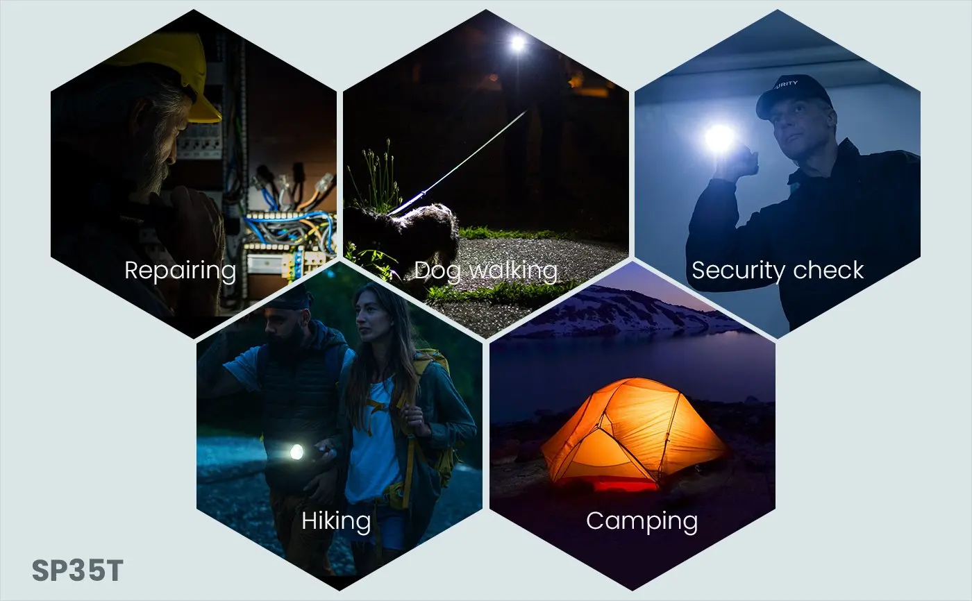 Advanced Temperature Regulation (ATR) technology: As the temperature rises, SP35T is programmed to automatically step down and step up the brightness to prevent overheating.